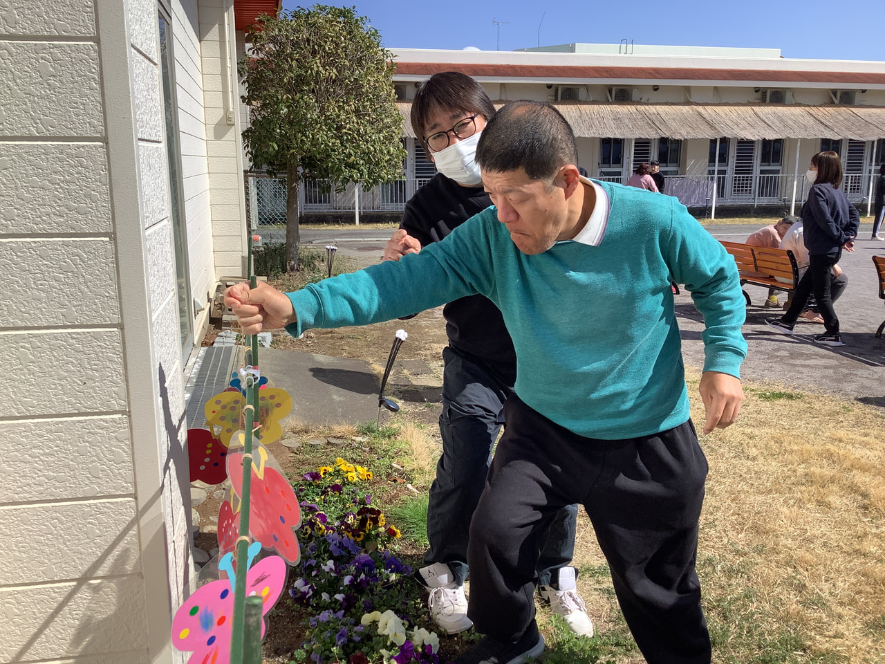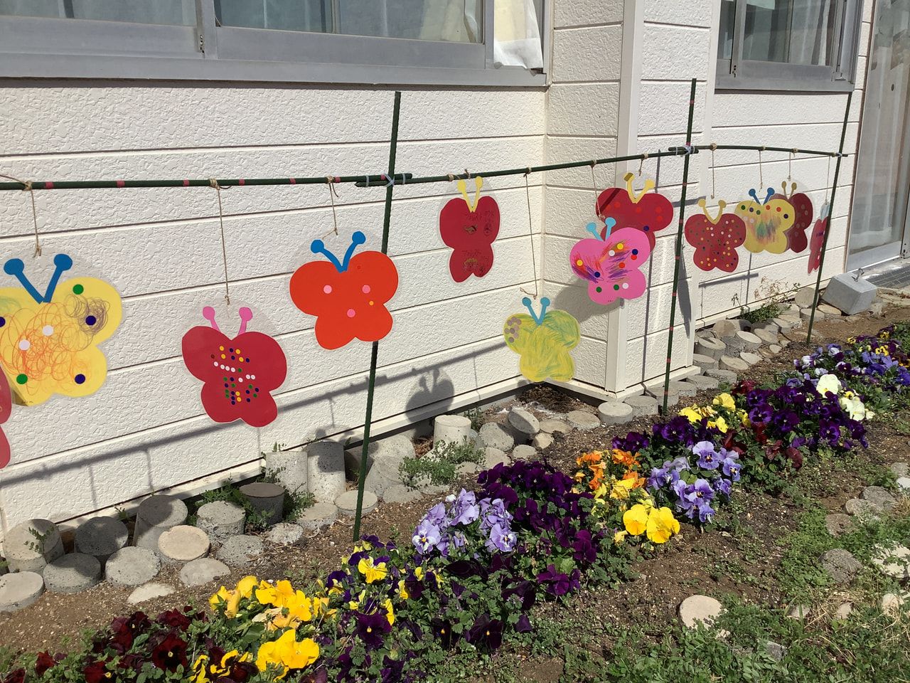 3月5日に通所の花壇に通所利用者さんみんなで作成した蝶の装飾を飾りました♪