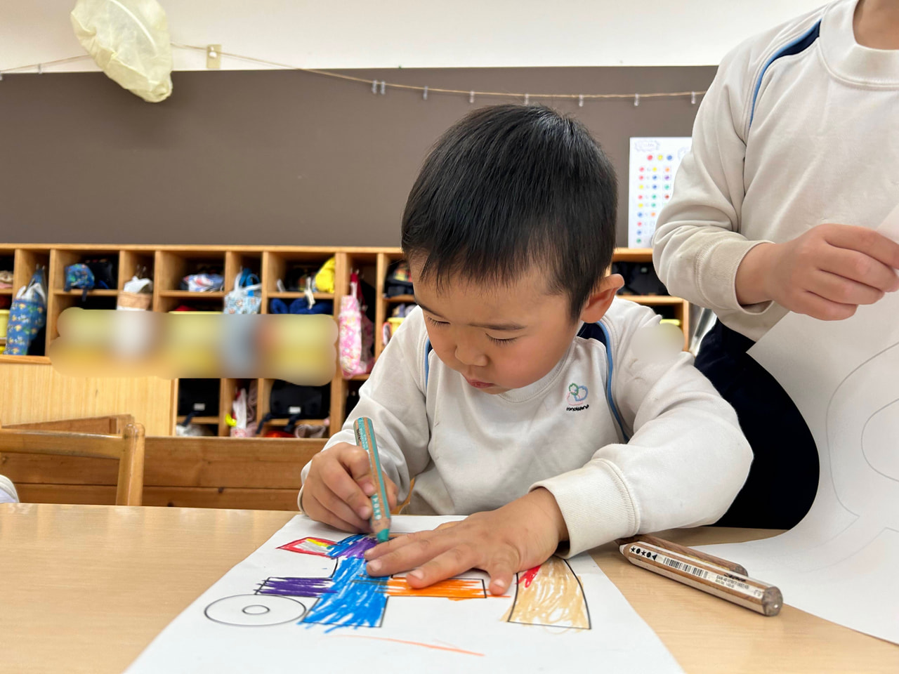 この日を迎えるにあたって、にじ組(年少)・つき組(年中)が看板作りやプレゼントの制作など、それぞれが心を込めて準備に取り組んできました。