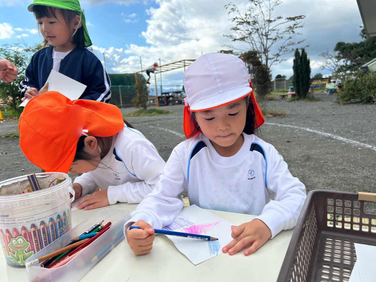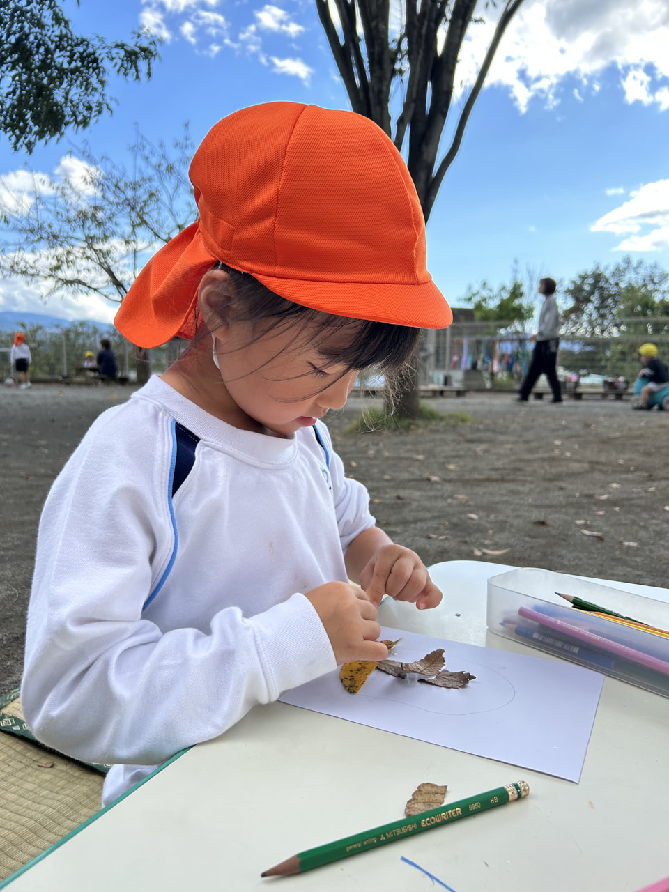 園庭や園周辺の落ち葉を使い、フロッタージュ(こすり絵)を楽しむ子ども達。